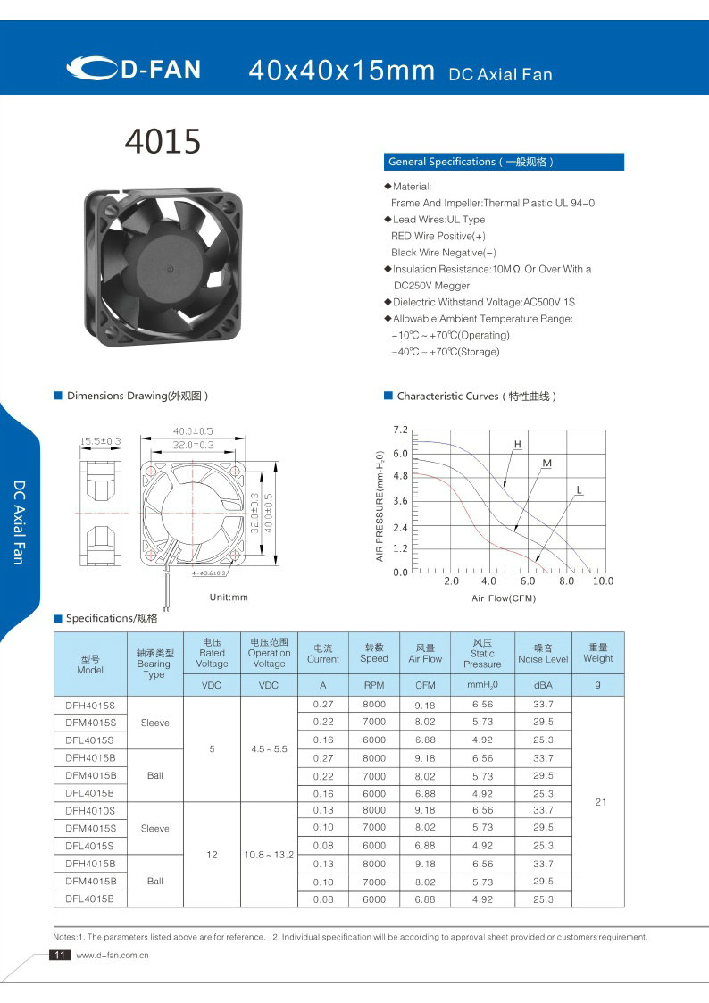 材料: 框架和叶轮:热塑UL 94-0 引线.UL类型 红色导线正极(+) 黑线负极(-) 绝缘电阻:10MΩ或以上,带DC250V高阻表 介电耐压:AC500V 1S 允许环境温度范围: -10℃-+70℃(运行) -40℃-+70℃(储存)